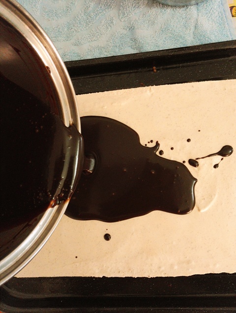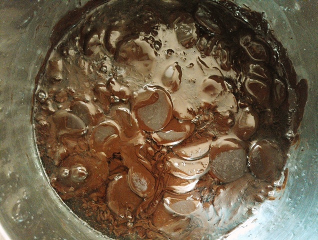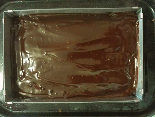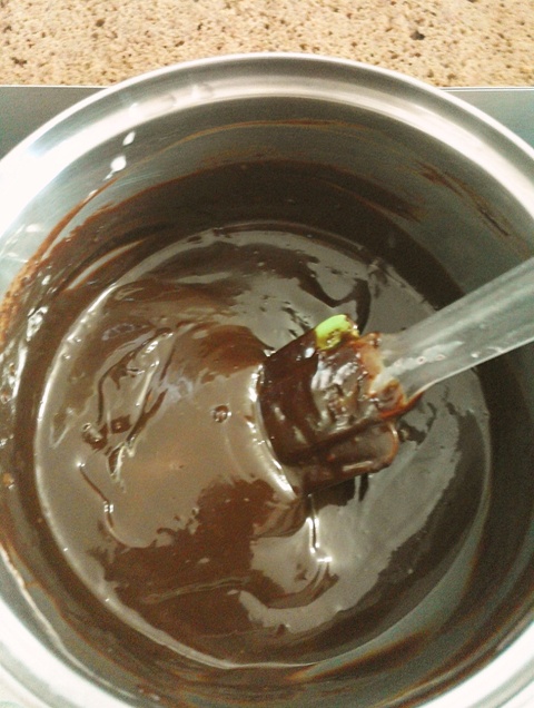 Am pregatit ganajul de ciocolata care se face foarte simplu din 200 gr de smantana lichida pe care am adus-o la punctul de fierbere intr-o craticioara dupa care am luat-o dupa foc si am adaugat 300 gr de granule de ciocolata cu lapte, am amestecat si am lasat deoparte sa se raceasca. Cand a inceput sa se inchege am pus ganajul peste blatul insiropt si am bagat la frigider.