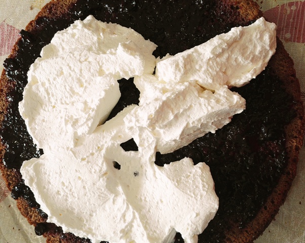 Am in fata cele trei elemente componenet ale tortului, blatul, crema, siropul si incep ansamblarea. Insiropez primul strat de blat, adaug dulceata de fructe de padure apoi crema de mascarpone si continui pana cand termin cu un strat de crema..