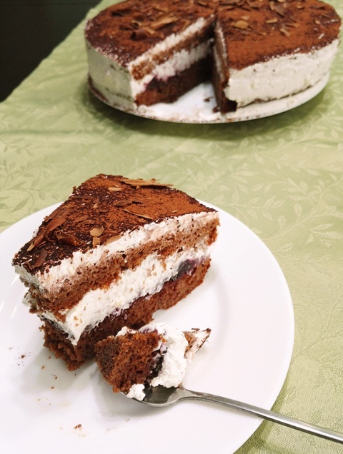 Acopar tortul cu crema ramasa, il nivelez cu ajutorul unei sparule si ii fac un décor simplu. De data asta folosesc cacao pudra pe care o presar deasupra apoi razui niste ciocolata si…gata tortul. Pentru un gust mai bun si mai intens il las la frigider pentru cateva ore astfel toate ingredientele isi amesteca aromele si in final rezultatul este delicios….un blat de ciocolata insiropat, gustul dulce acrisor al fructelor de padure si crema fina de mascarpone toate la un loc…o incantare.