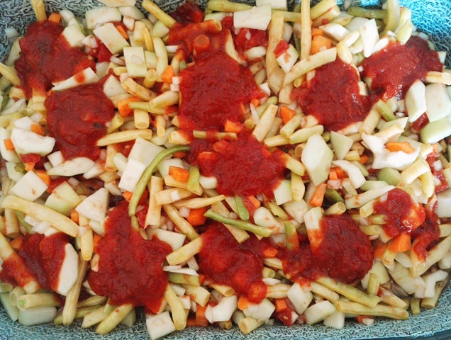 Am tocat marunt 2 graunti de usturoi, o ceapa mare si o bucata de telina si am tocat rondele un morcov iar pe toate le-am pus intr-o tava potrivita pentru cuptor. Apoi am spalat legumele proaspat culese si le-am taiat in bucati maricele si le-am pus in tava peste zarzavaturi, am adaugat o cutie de conserva cu rosii intregi pe care le-am tocat marunt , am presarat sare si am stropit cu ulei si am amestecat totul. Pentru putina culoare am pus cateva linguri de bulion impreuna cu o lingurita de zahar pentru a echilibta gustul acrisor al rosiilor si al bulionului si , din nou, am amestecat iar deasupra am pus doua crengute de marar verde pentru un plus de aroma.