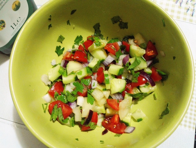 Salata in stil mediteranean nu lipseste cat tine vara. Am pregatit-o foarte repede din 2 rosii, 1 ardei gras, 1 castravete, o ceapa rosie, pe care le-am tocat cuburi, cateva fire de patrunjel tocat marunt, ulei de masline, zeama de lamaie si limeta si un praf de sare.