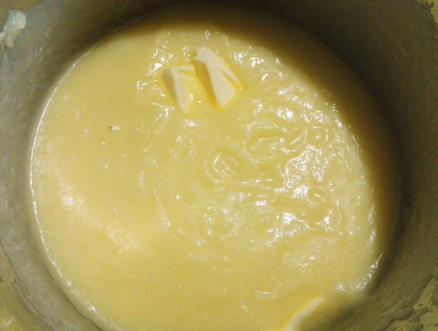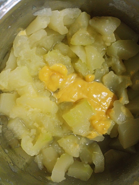 Dupa ce s-au fiert bucatile de dovlecel, le-am scos din apa si le-am pus la scurs. Apoi le-am pus intr-un castron impreuna cu 2 lingurite de mustar, 50 gr unt, 3 catei de usturoi pisati, sare, zeama de lamaie,2 linguri parmezan ras si am mixat totul pana cand a devenit o pasta foarte moale si fina dupa care am adaugat patrunjel verde tocat marunt.